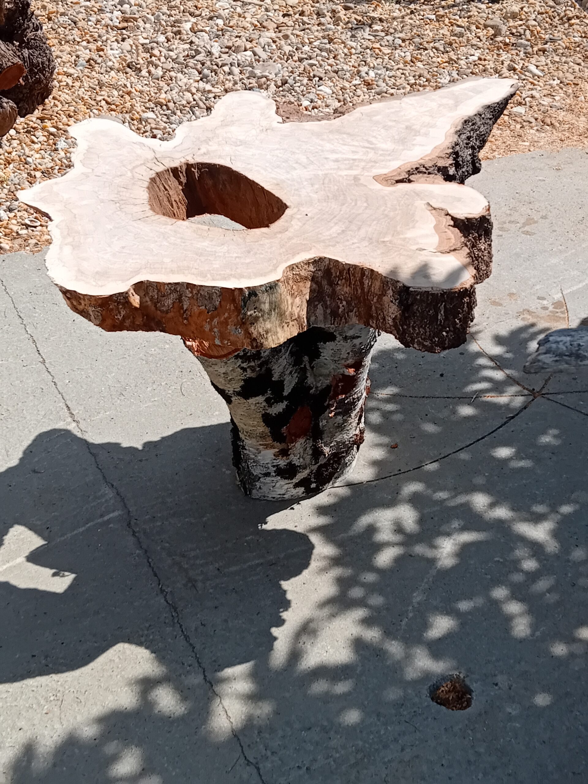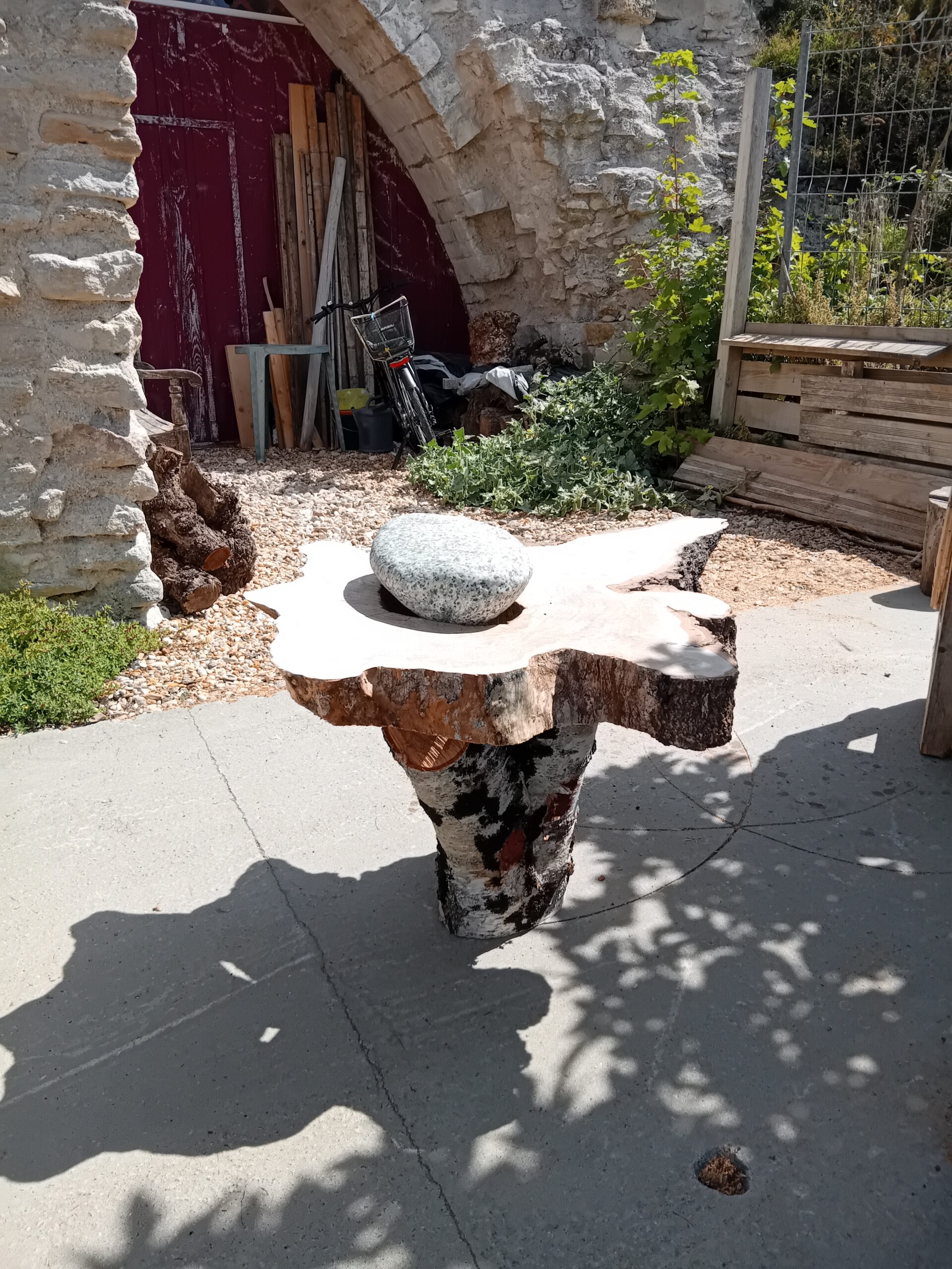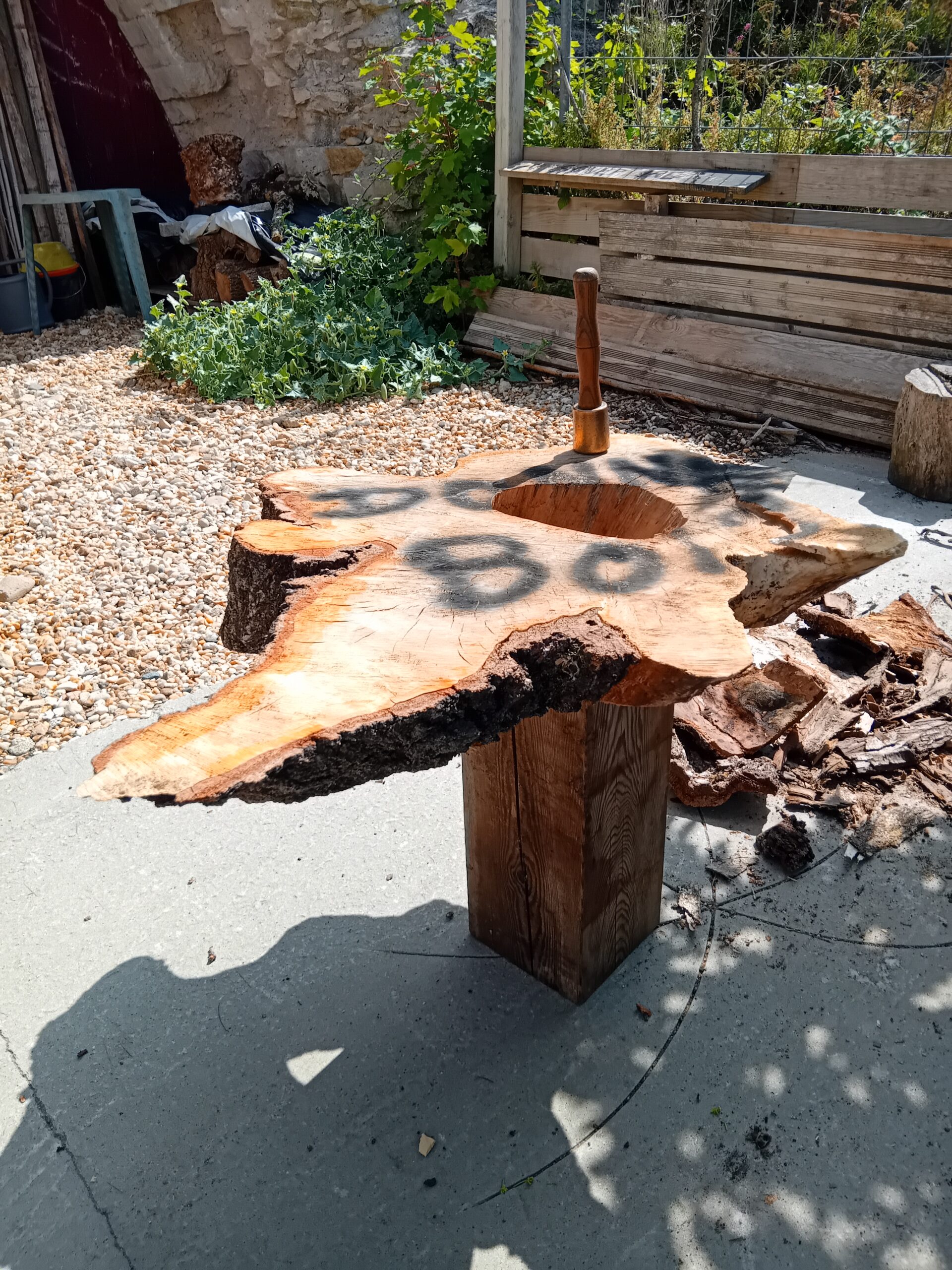 Heureusement, j’ai pu sauver quelques beaux billots de cet arbre qui m’avait accompagné pendant toutes ces années. Ramenés à l’atelier et badigeonnés de paraffine pour un séchage plus lent, ces billots attendent maintenant d’être transformé en sculpture. J’ai réalisé un premier essai avec une belle tranche de la base du tronc et un départ de branches en le transformant en table basse.