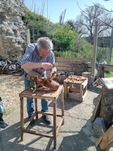 Nous nous sommes retrouvés fin Mars pour démarrer le challenge avec un temps sec et beau dans un atelier enfin praticable après un hiver bien pluvieux. Nous avons choisi deux buches de poirier (bois assez homogène) pour réaliser les deux projets.